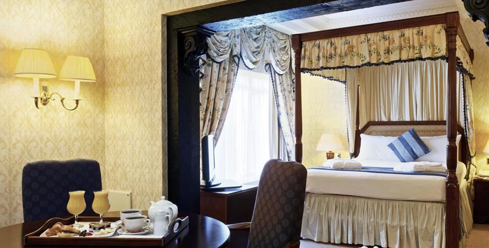 Our Executive Suite is a stunningly spacious and calming space. It features a separate living area with dining table, plush chairs, and a large bedroom with an elegant canopy bed. Complimentary overnight parking.